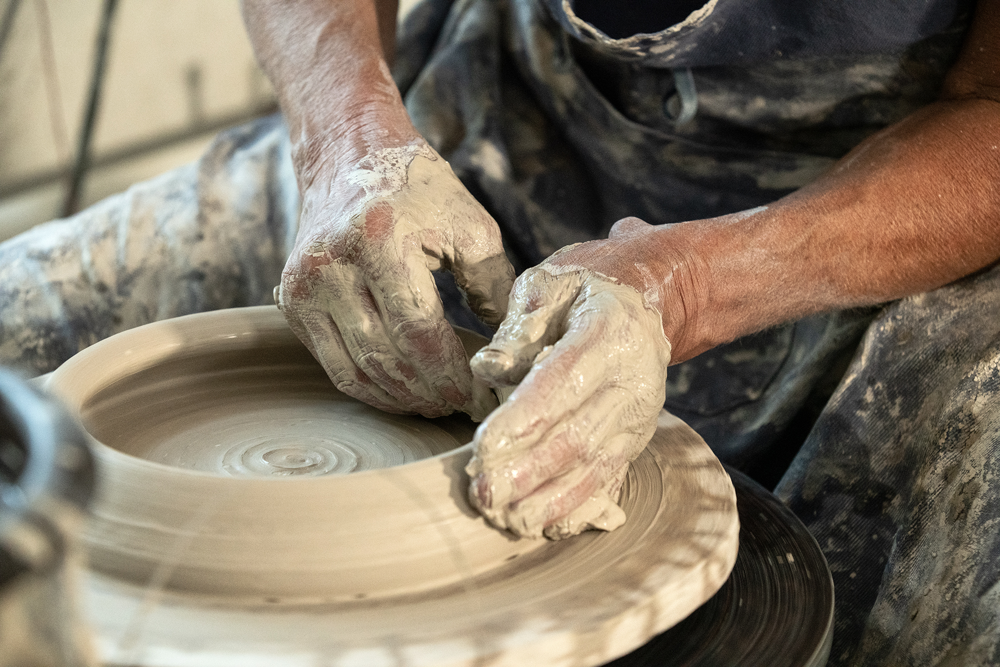 Meine Art zu Drehen ist, mit wenigen Handgriffen die Form zu bestimmen – die Töpfe können ruhig auf der Scheibe tanzen! Dabei stelle ich mir vor, wie sie später im Feuer stehen und male mir aus, welche Farben sie durch den Brand bekommen.