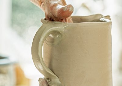 Es stellen sich die immer neuen alten Fragen – die wohl wichtigste: Ist die Form alltagstauglich? Dann: Verzichte ich auf Dekoration oder nicht? Stempeln, Bemalen, Bedrucken? Das Abenteuer Henkel … Welche Engobe (gefärbter Tonüberzug) trage ich auf? Was für eine Glasur wähle ich für innen?